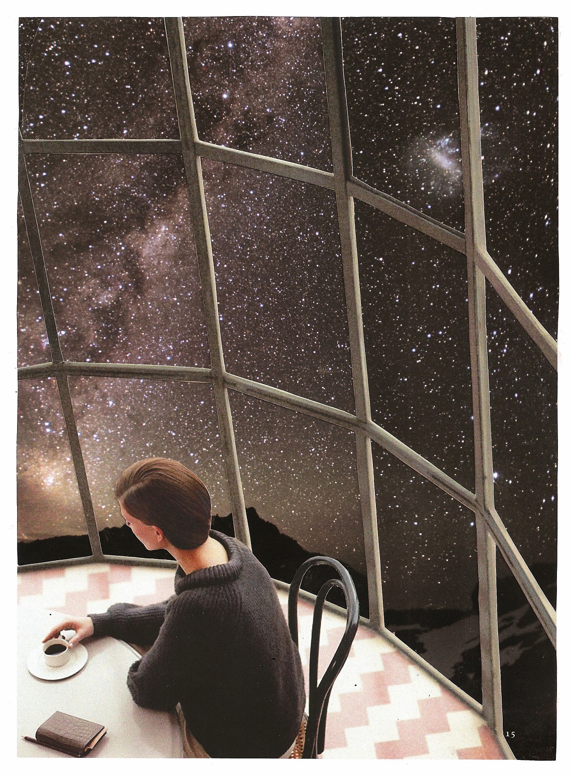 Collage of paper, re-arranged words from an old "Mythology" book by Hamilton, and red thread.